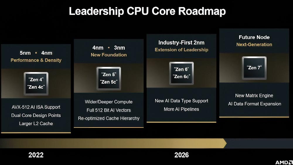 Zen 6 與 Zen 6c 處理器架構可以見到新的 AI Data 型態支援,並且加入更多的 AI Pipelines 用以鞏固 AI 市場的應用。至於 Zen 7 處理器架構方面,除了先進製程外,AMD 僅揭露新的矩陣引擎與 AI Data Format 的拓展,其他細節並沒有在這份簡報中提到。