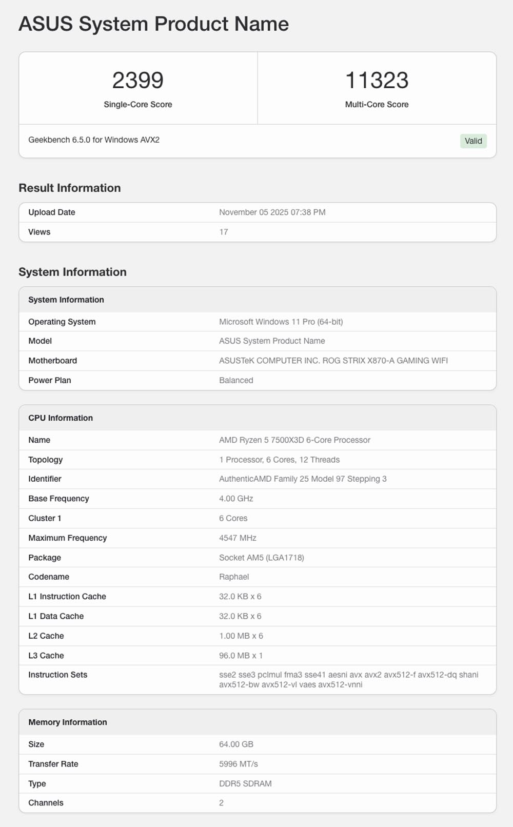 Ryzen 5 7500X3D 是一款擁有 3D V-Cache 技術的 6C12T 處理器,Geekbeench 曝光的資料來看,基本時脈微 4.0GHz,而最大超頻時脈則可以達到 4.6GHz。另外,這款 Zen 4 處理器架構的處理器,因為擁有 3D V-Cache 技術,所以擁有 96MB 的 L3 Cache 配置。