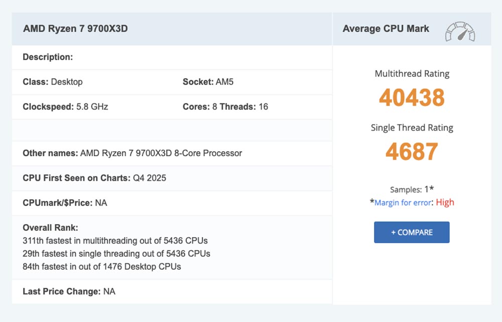 Ryzen 7 9700X3D 採用的是 Zen 5 處理器架構,一款 8C16T 的處理器。Passmark 資料庫頁面顯示,這款處理器的最高時脈可以到達 5.8GHz,以這樣的數據來看,它要高於 Ryzen 7 9800X3D 的 5.2GHz 以及 Ryzen 7 9850X3D 的 5.8GHz。