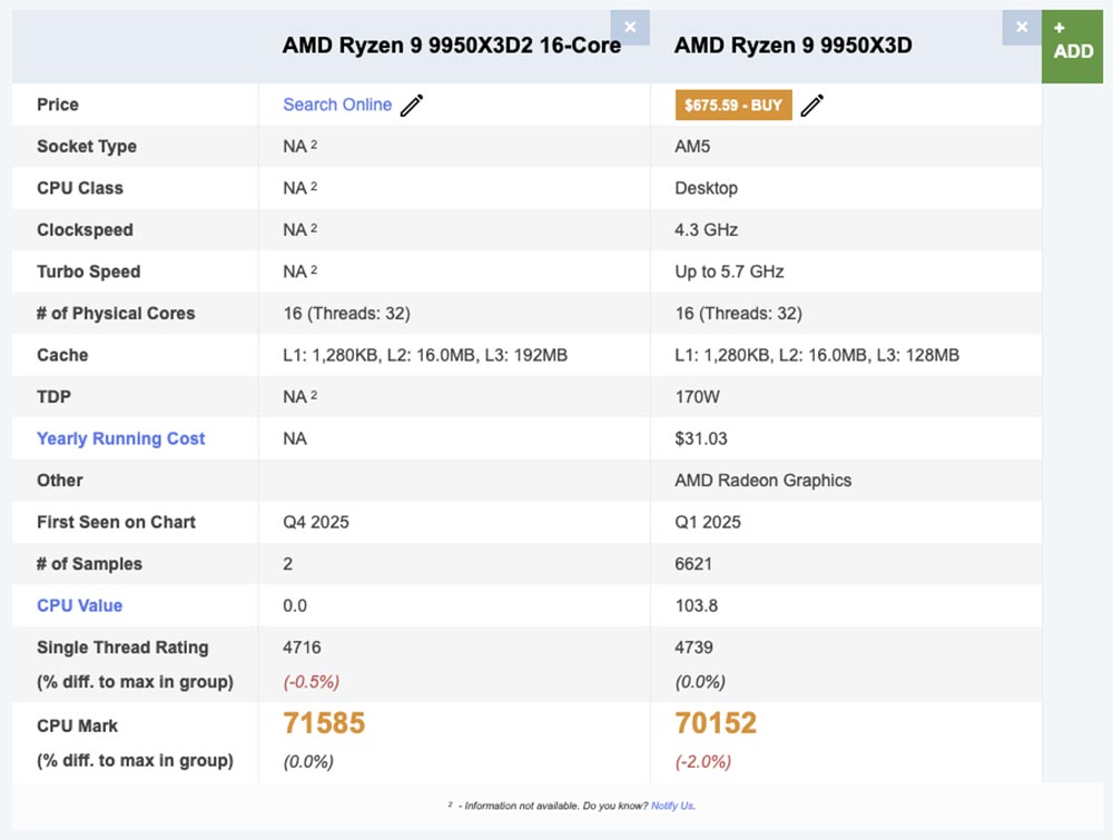 Ryzen 7 9850X3D 意外被 AMD 自家官網劇透之後,在 PassmarkGeekbench 資料庫中,也可以開始找到另一款 Zen 5 處理器架構的產品 – Ryzen 9 9950X3D2。
