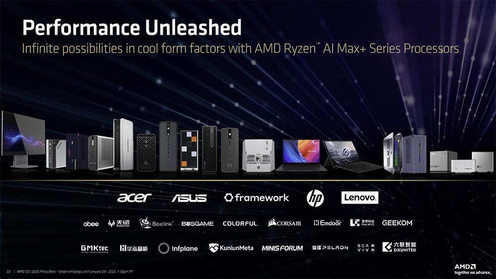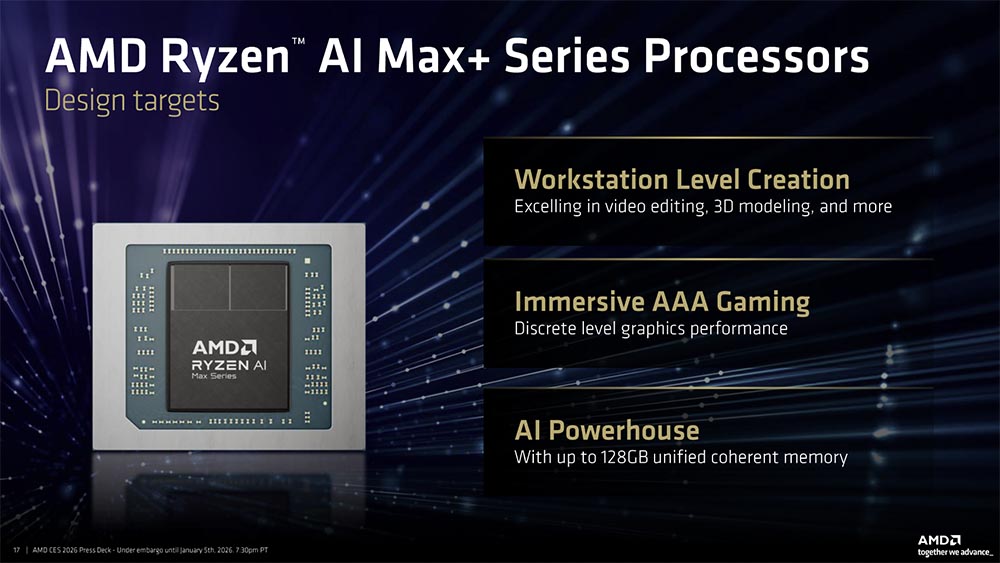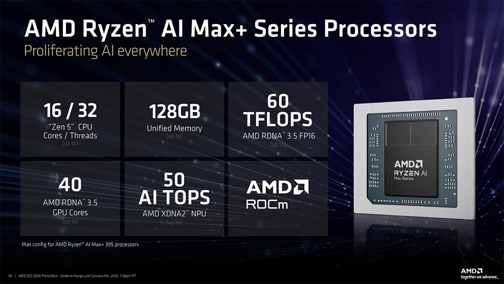除了 Gorgon Point 的 Ryzen AI 400 系列處理器外,AMD 也在 CES 2026 更新了 Ryzen AI Max+ 系列處理器產品線;Ryzen AI Max+ 代號為 Strix Halo,是 AMD 在 CES 2025 推出的系列產品線。