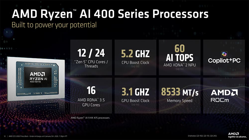 就如早前預測,AMD 在 CES 2026 揭露了代號 Gorgon Point 的 Ryzen AI 400 系列處理器;Gorgon Point 採用 Zen 5 處理器架構、RDNA 3.5 GPU 架構與 XDNA 2 NPU,而這些種種,皆是為了讓使用者有更好的 AI 體驗。