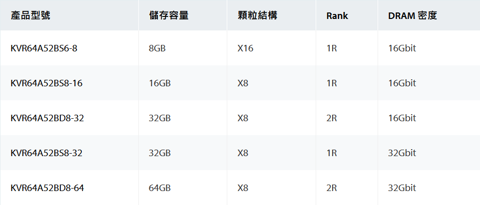 ValueRAM DDR5 CUDIMM 提供 8GB、16GB、32GB 和 64GB 容量選項,採用單一模組包裝銷售模式,產品線規畫如下圖所示。Kingston 選用 16Gbit 與 32Gbit 容量顆粒來製作模組,可留意 KVR64A52BD8-32(32GB)和KVR64A52BD8-64(64GB),同為 2 / Dual Rank 類型。