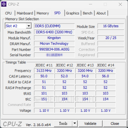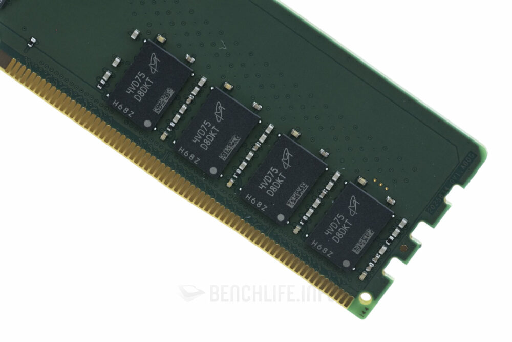 以 Kingston 提供的 16GB(KVR64A52BS8-16)樣品為例,採用 Micron 原生 DDR5-6400MT/s、16Gbit 顆粒,製作成 x8 顆粒結構、1 Rank、單面線路設計布局。SPD 預載 JECEC DDR5-6400 組態為 52-52-52-103 @ 1.10V,視搭配的主機板而定,想拉高時脈或壓低時序未嘗不可。