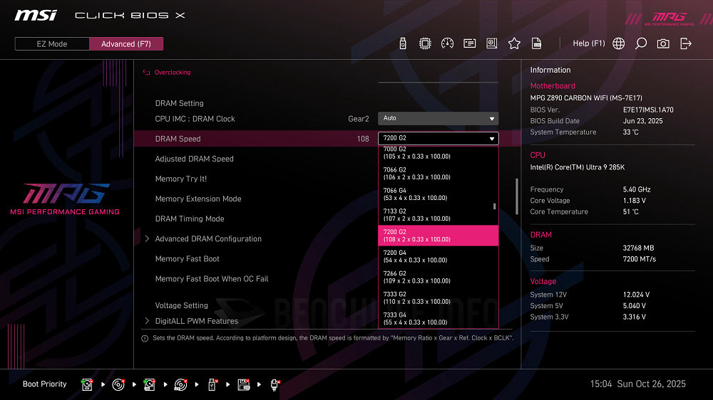 以搭配 MSI MPG Z890 Carbon WiFi 為例,該主機板會自動將時序微調成 52-51-51-102,如果想進一步試試手氣,可以簡單從「DRAM Speed」選項著手。我們所用配備得以套用其中的 G7200 G2(DDR5-7200MT/s)組合,主機板對策是會將時序放寬至 58-58-58-115,因為並未同時增加工作電壓。