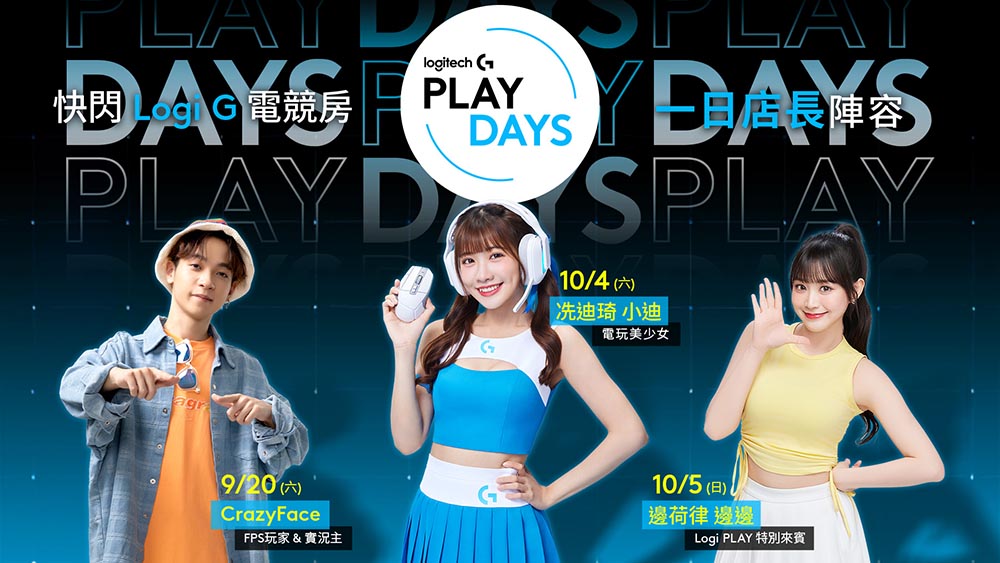 9/19 至 10/5,Logitech G 邀請玩家一同前往台北三創生活園區 1F 玻璃屋,體驗限時快閃「Logitech G 電競房」,讓每一位玩家玩出屬於自己的電競節奏;Logi PLAY 形象大使小迪訂於 10/4 擔任一日店長與玩家互動,同時邀請實況主 Crazyface 與特別來賓人氣啦啦隊成員邊荷律,攜手玩家點燃遊戲戰鬥氛圍。期間憑 Logi Store 台北三創電競旗艦館與台北八德旗艦館發票,購買電競品項滿 3,690 元可兌換限量「小迪拍貼」或「珠珠相卡」乙次,數量有限兌完為止!