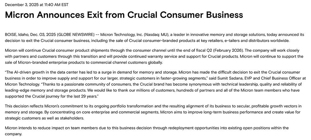 在 Micron 官方新聞稿中,Crucial 會一直出貨至 2026 年 2 月份,但在這樣的前提下,應該也不會有太多玩家會選擇這家品牌,畢竟還要考量到後續的保固問題… 關閉掉 Crucial 這個品牌,意味著後續我們不會在通路上見到相關品牌的記憶體、SSD 以及外接儲存設備。