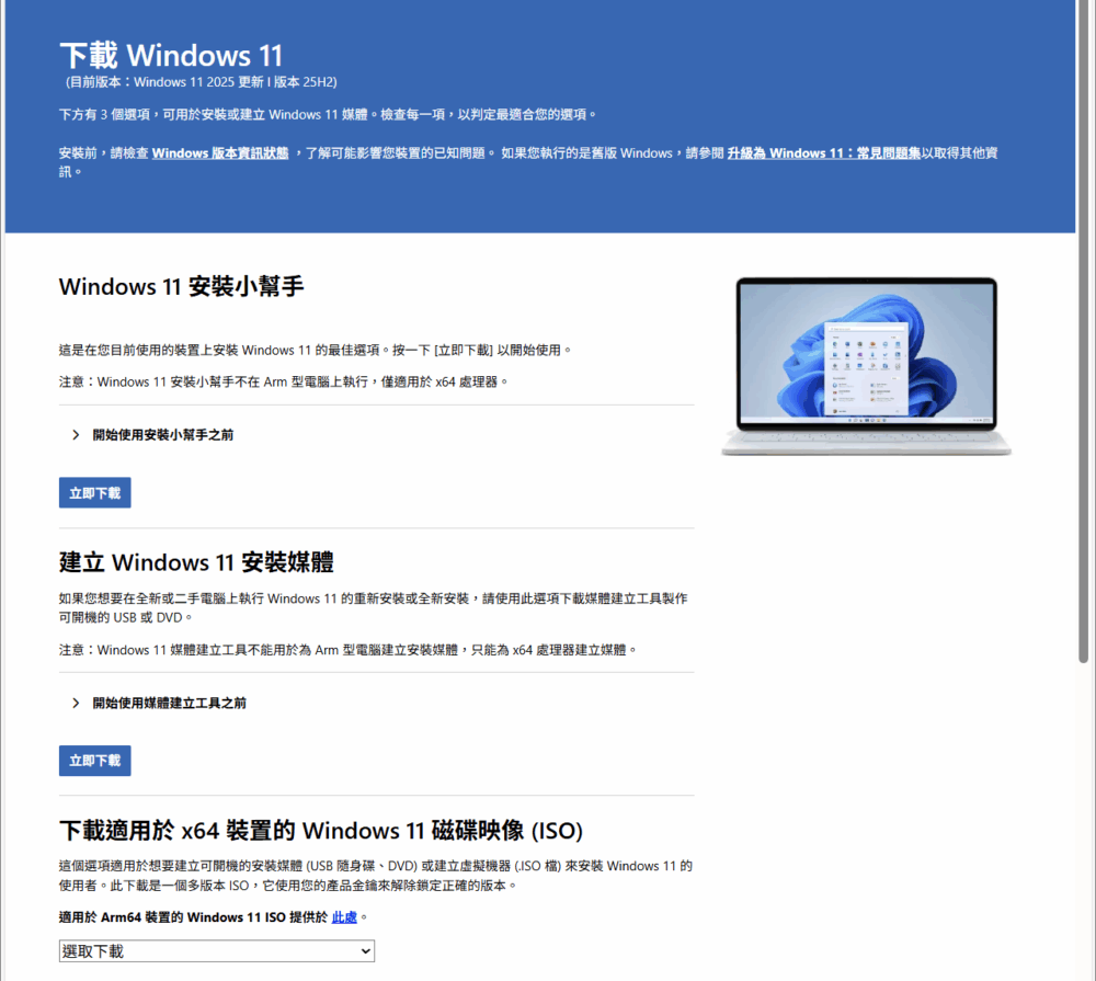 如果想馬上試試 Windows 11 25H2,可以到 Microsoft 官網自行下載,取得方式一如既往。包含「Windows 11 安裝小幫手」、「建立 Windows 11 安裝媒體」,還有我們推薦全新安裝會使用到的 「下載適用於 x64 裝置的 Windows 11 磁碟映像 (ISO)」,ISO 部分同時提供 x86 與 Arm64 版本選擇。