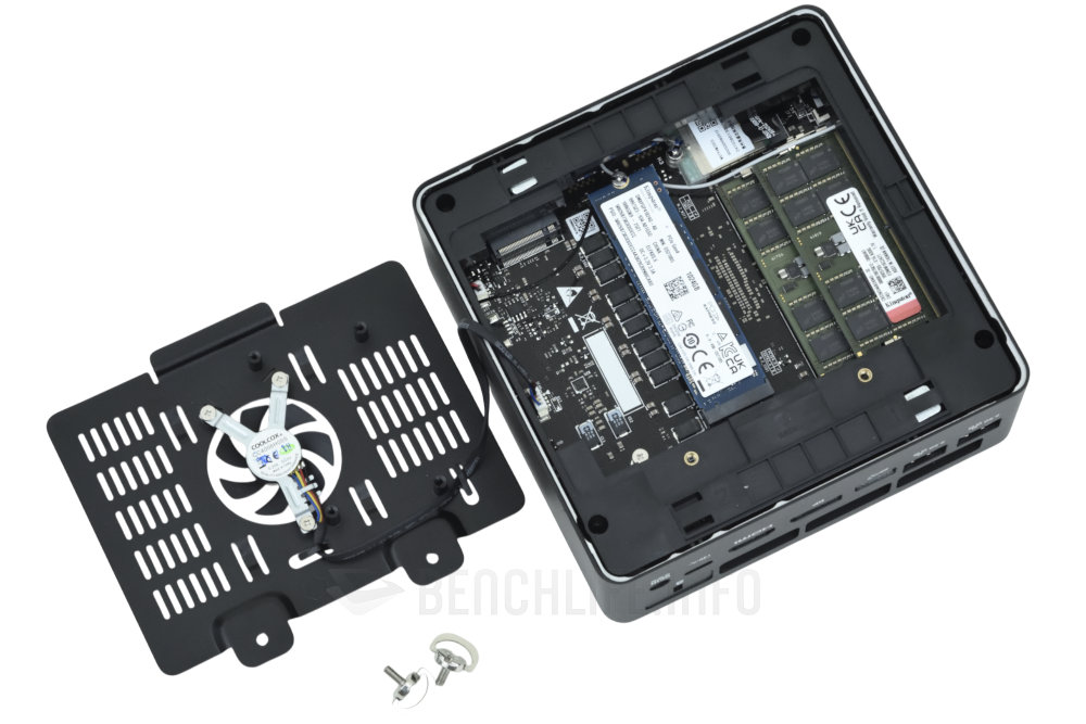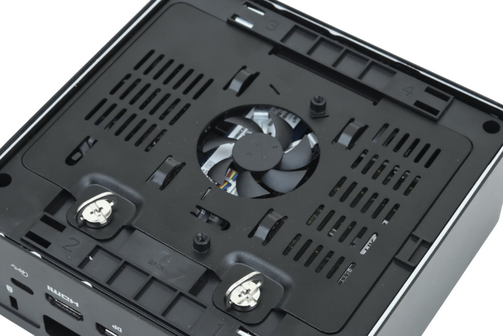 一如 UCFF 標準設計,拆開底蓋內部可見區域為電路板的反面,DDR5 SODIMM 與 M.2 Type 2280 / PCIe 4.0 NVMe 插槽各有 2 組。就設計調校而言,官方標示支援容量上限,記憶體為 96GB 而 M.2 是各 8TB。