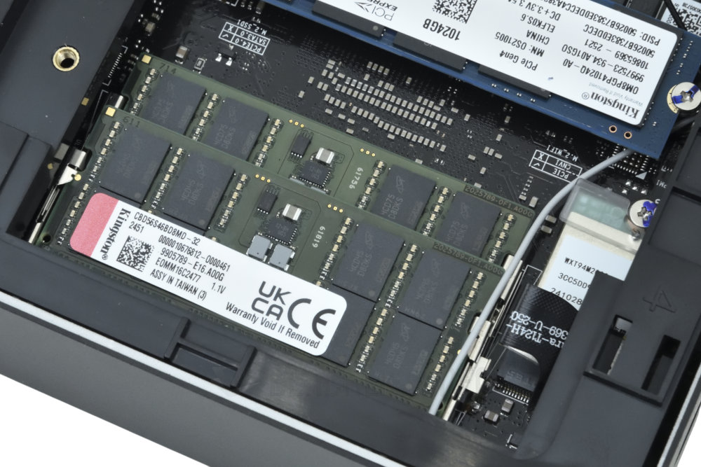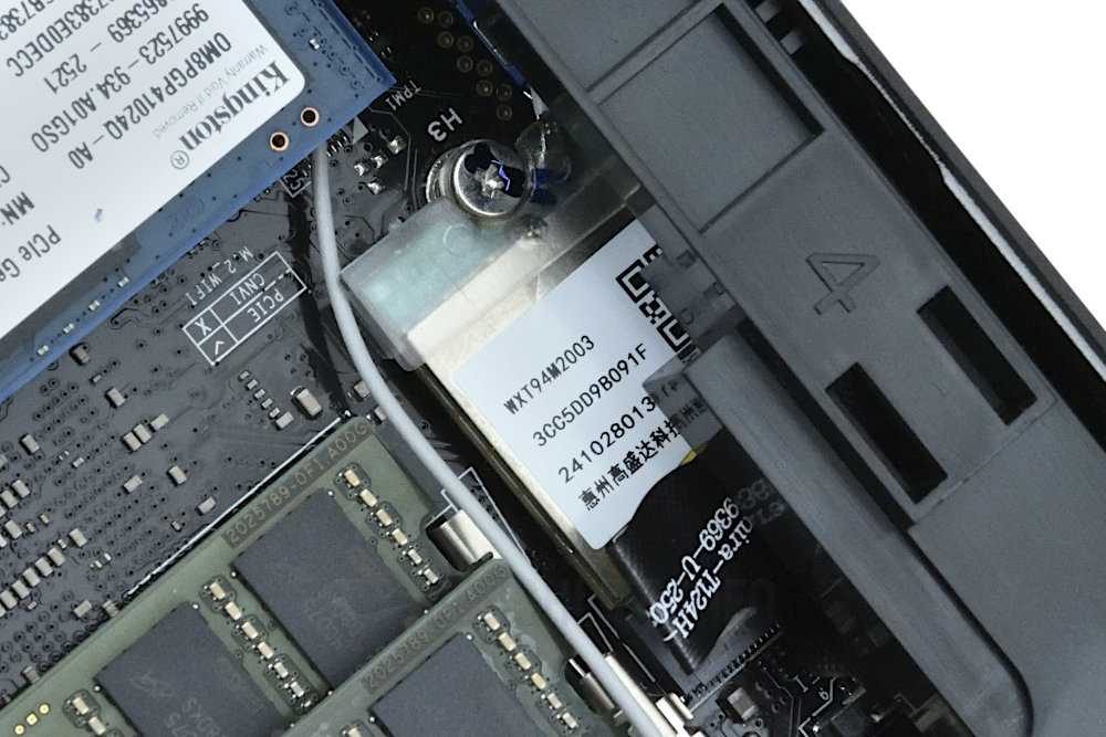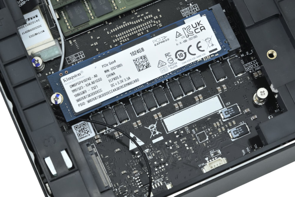 樣品機預載模組皆來自 Kingston,分別為 DDR5-5600 SODIMM 16GB x 2 與 PCIe 4.0 NVMe SSD 1TB(OEM 產品)。如拆卸階段看到,此區域有顆系統風扇負責伺候,是無須費心處理固態硬碟模組的散熱問題。