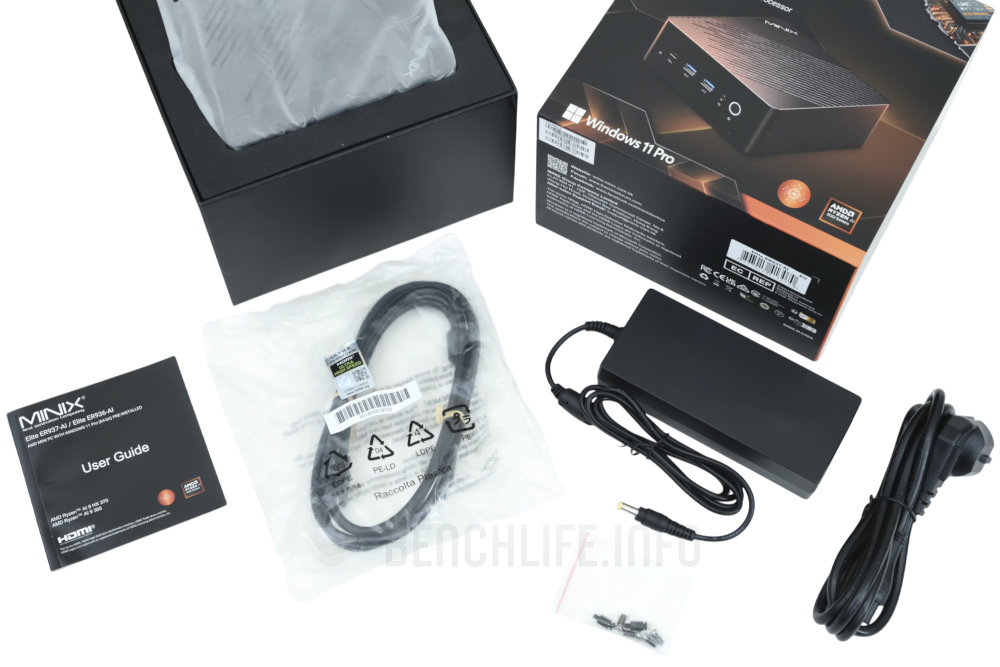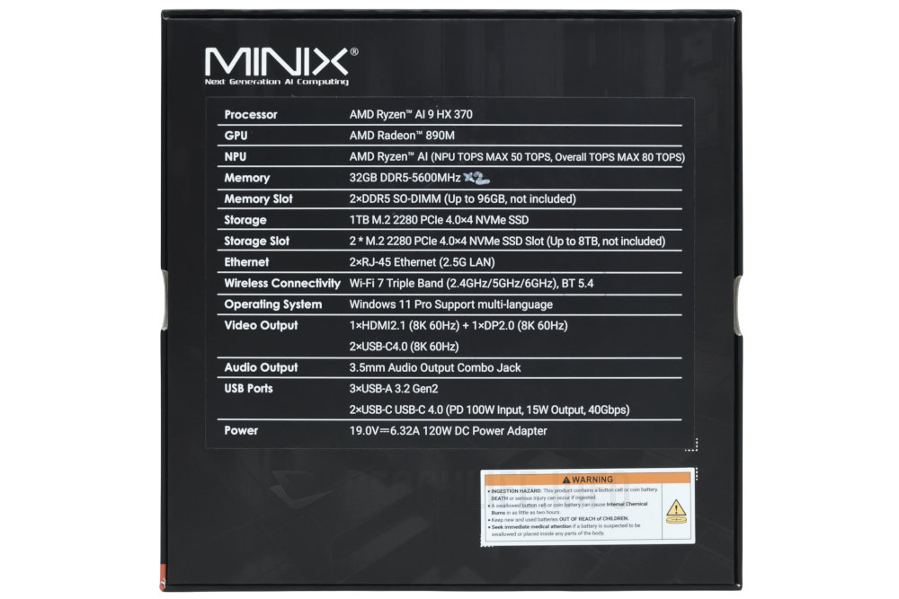只是無可避免的,外接變壓器仍然會占用些空間,Minix 選用 HuntKey 製品供電能力為 128.08W(19.0V、6.32A)。另外有趣的是,產品包裝內同樣隨附 HDMI 2.1b 線材,只需自備鍵盤與滑鼠就能開機使用。