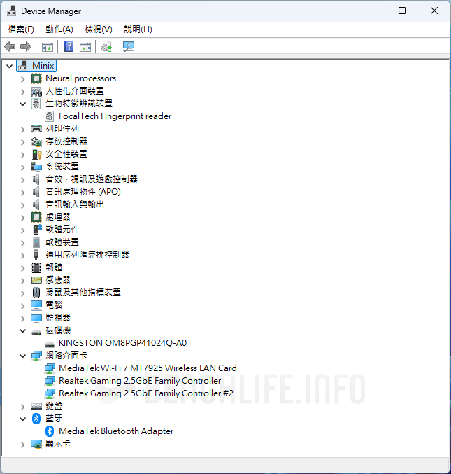 一旁還能看到 Wi-Fi 7 無線網路,該模組採用 MediaTek MT7925 控制器,支援 2.4GHz、5GHz、6GHz 頻段與 160Hz 頻寬。至於藏在某處的 2.5GbE 控制器,於系統層查看,都是使用 Realtek RTL8125 方案。