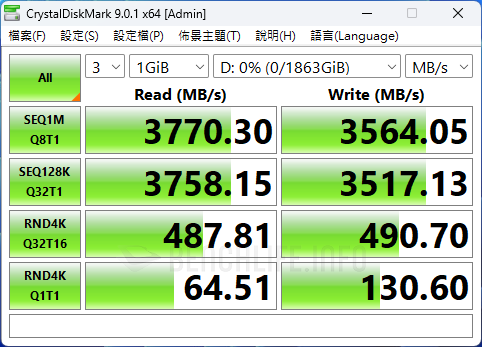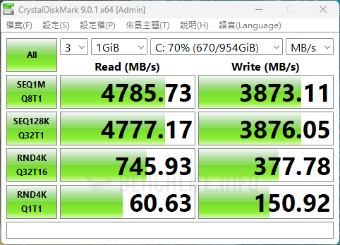 另外就儲存面向來看,出廠所預載固態硬碟,約略能夠達到讀取 4785.73MB/s、寫入 3,873.11MB/s 速度。至於 USB4 介面,搭配梵想 PS3000 外接固態硬碟時,表現為讀取 3,770.30MB/s、寫入 3,564.05MB/s。