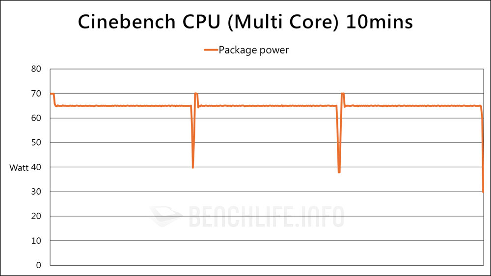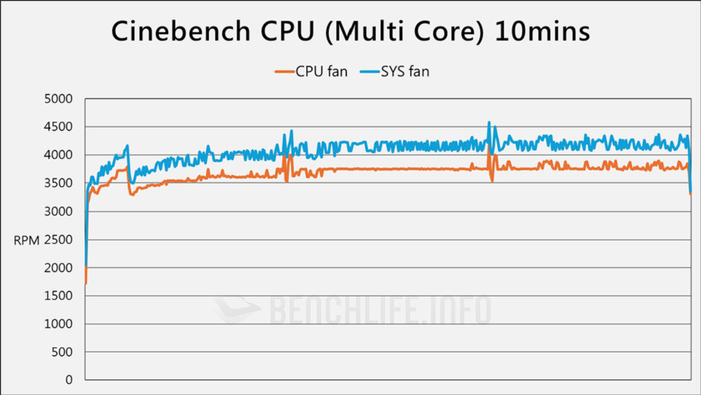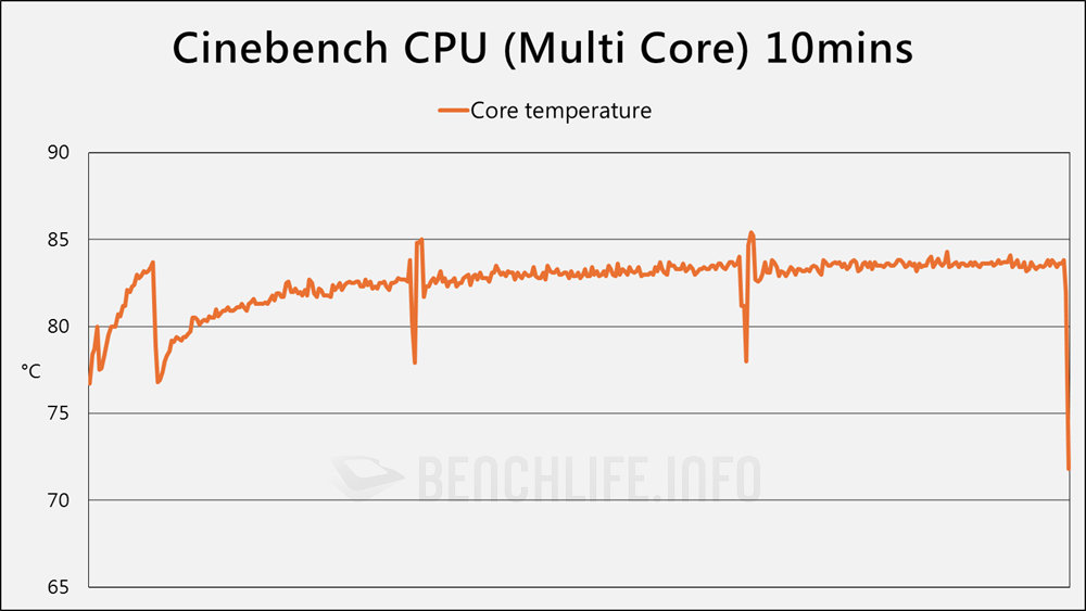 透過 Cinebench 評估系統散熱,處理器大多在 85℃ 以內(環境約 25℃),功耗一如官方標示達到 65W 左右,時脈變動相當穩定意味解熱效率足夠。而 2 顆散熱風扇,最高轉速分別不超過 4,200RPM、4,600RPM,噪音量是在可接受範圍內。