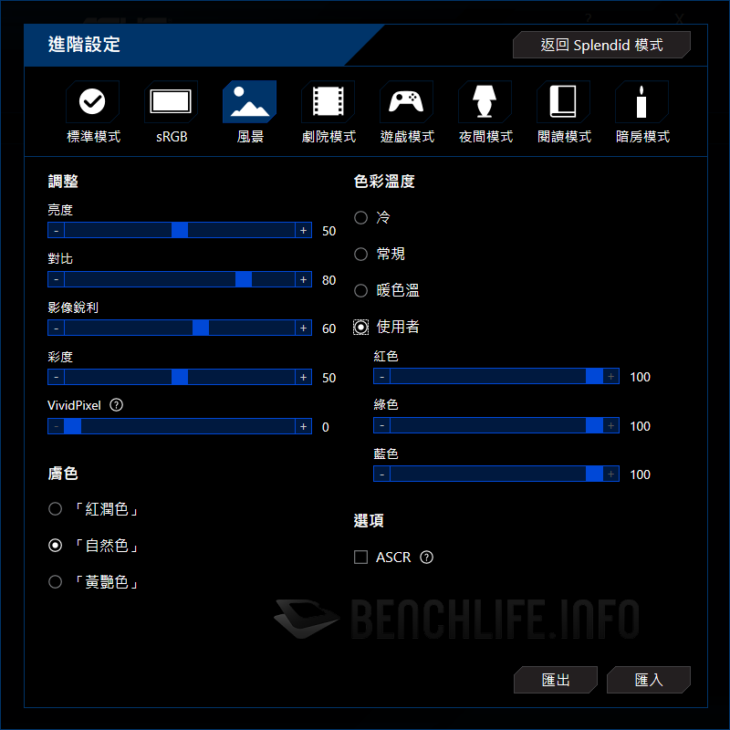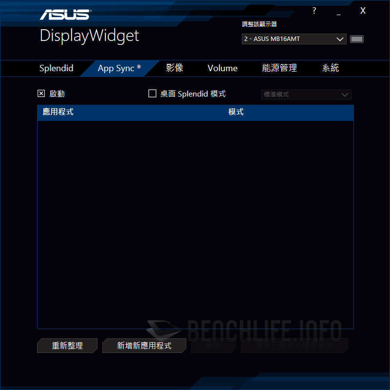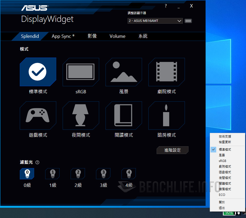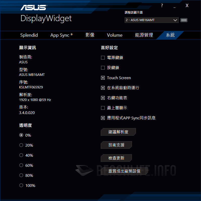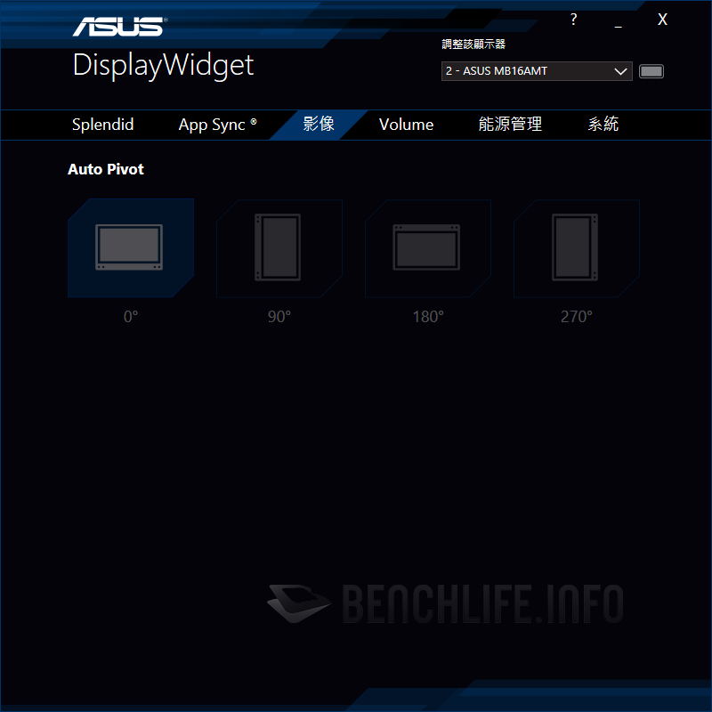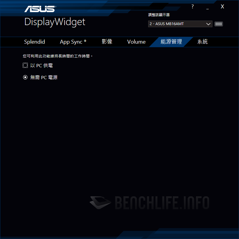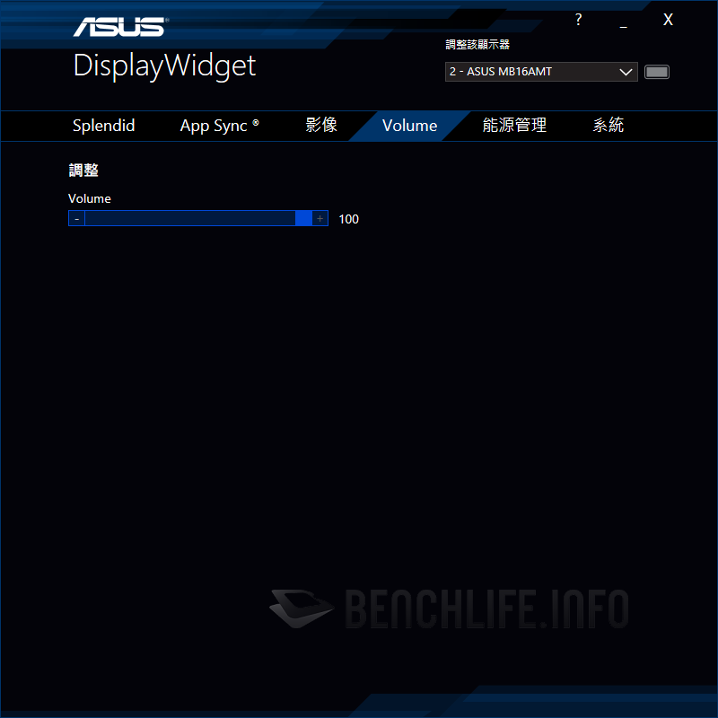 除了必要的電源開關,其餘如 OSD 操控之類按鍵,簡化為只有 1 顆 5 向鍵。如下圖所示,往四個方向撥動是快捷鍵作用,預設可以調整「音量」、「輸入選擇」、「輸入裝置」。正中央按壓到底,則是進入 OSD 完整選單,未開機時如果持續按壓久一點,能查看電池蓄電量。Windows 10 使用者可以安裝 DisplayWidget 軟體,方便快速調整一些主要項目,惟 QuickFit 功能格線圖樣、Trace Free 加速、GamePlus 遊戲工具等幾項,還是得從 OSD 進行設置。