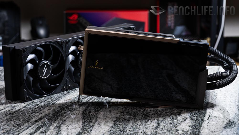 首先是 ROG Matrix Platinum GeForce RTX 5090,它採用 3 + 1 風扇的空冷設計,至於 MSI GeForce RTX 5090 Lightning Z 並沒有如 Suprim 或者是 Gaming Trio 般維持空冷散熱,而是為這款旗艦顯示卡選擇 360mm 的一體式水冷散熱設計。