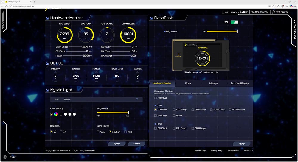 MSI Lightning Hub 整合了 Hardware Monitor、OC Hub、Mystic Light 以及對 MSI GeForce RTX 5090 Lightning Z 8 吋面板最重要的 FlashDash 功能。