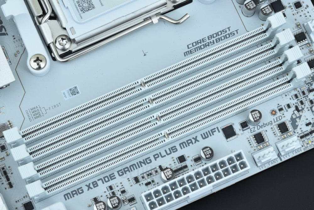 4 組 DDR5 UDIMM 插槽的可玩性看來依舊,像是搭配 Ryzen 9000 系列處理器時,1DPC、1R 安裝條件可達 DDR5-8200+ MT/s。同樣的,UEFI BIOS 包含提供 Latency Killer、High Efficiency Mode 與 Memory Timing Preset,以及 Memory Try It! 等記憶體相關效能強化選項。