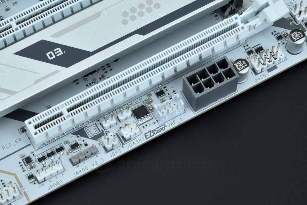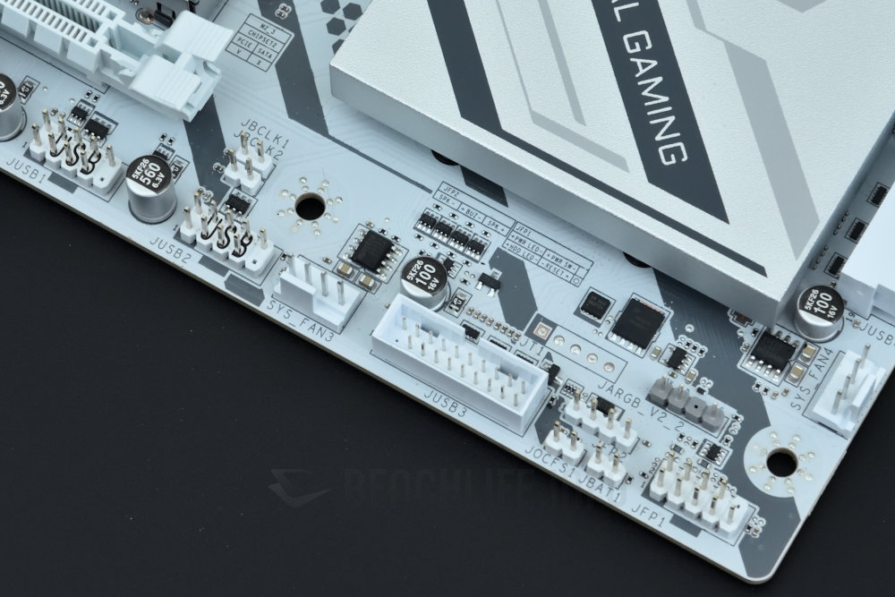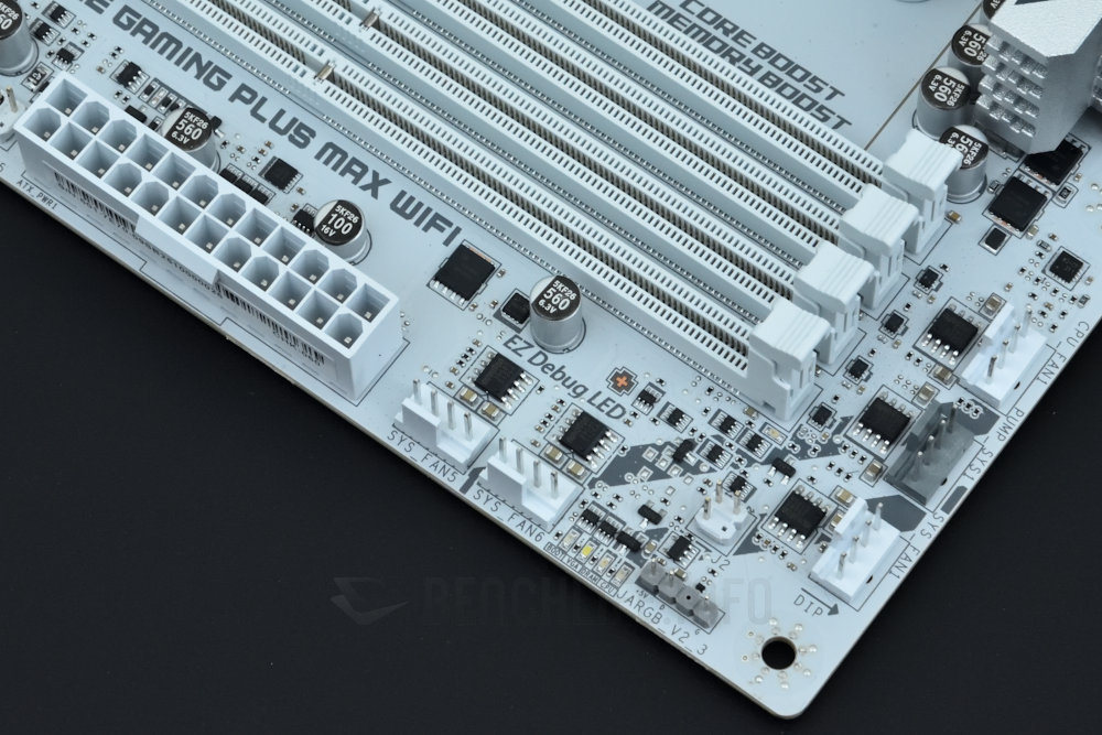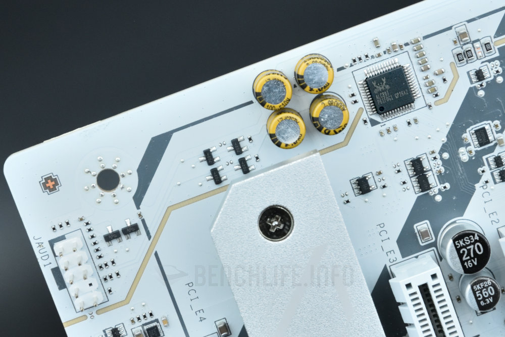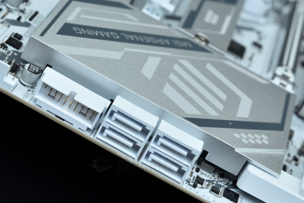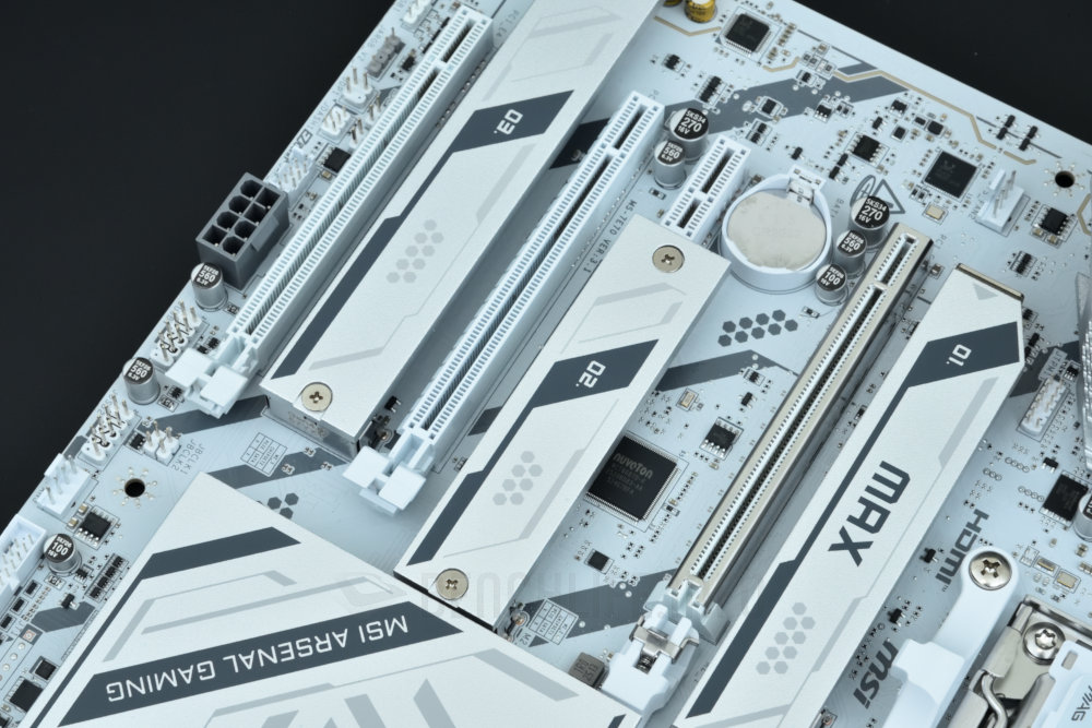 儲存維持配置 4 組 SATA 6Gb/s 與 3 組 M.2 插槽,M.2 全都有配備散熱片與模組免工具拆裝設計,只是這等級產品自然不會出現散熱底板。除此之外,只有 M.2_1 結合 EZ M.2 Shield Frozr II 快拆散熱片,其餘 2 組依然沿用舊式 M.2 Shield Frozr,拆裝散熱片會需要出動螺絲起子。