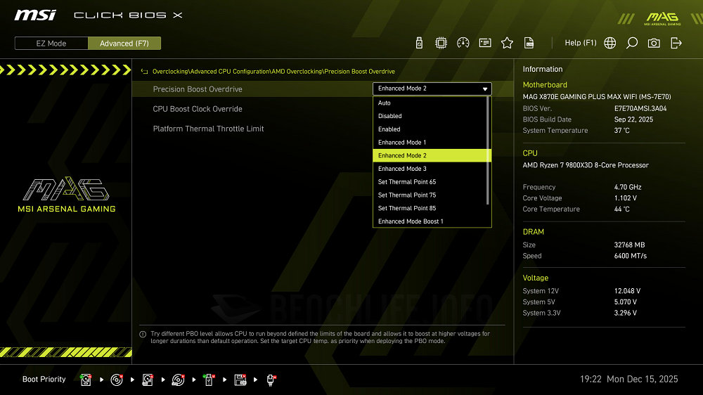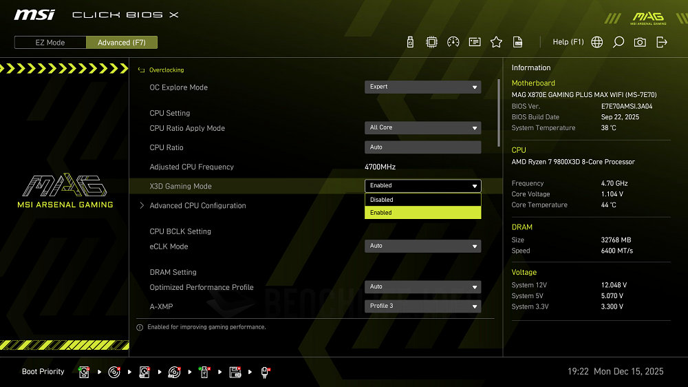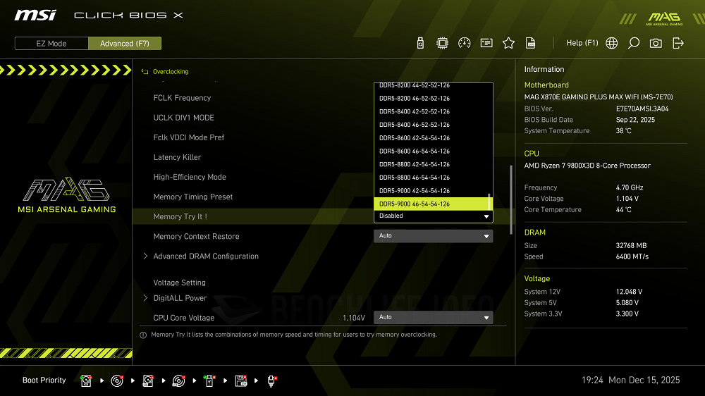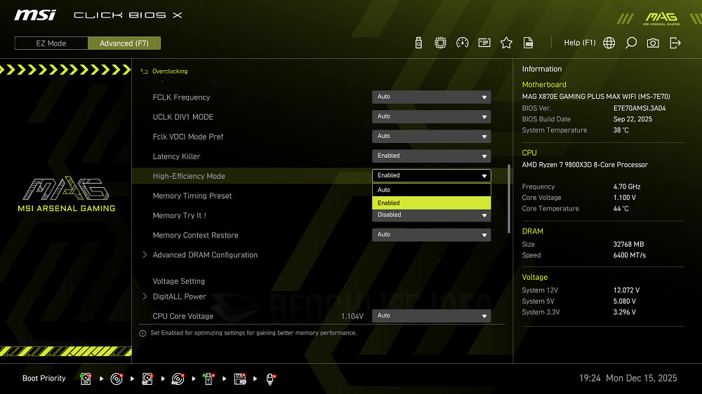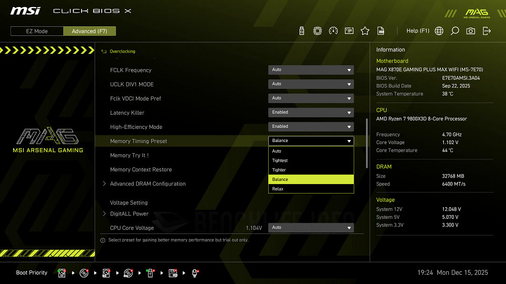 MAG X870E Gaming Plus Max WiFi 實際搭配 Ryzen 7 9800X3D 處理器,在 UEFI BIOS 內啟用 Precision Boost Overdrive > Enhanced Mode 2 與 X3D Gaming Mode 選項,而記憶體類包含 Latency Killer、High Efficiency Mode、Memory Timing Preset > Balance 等設定,實測結果彙整如下。