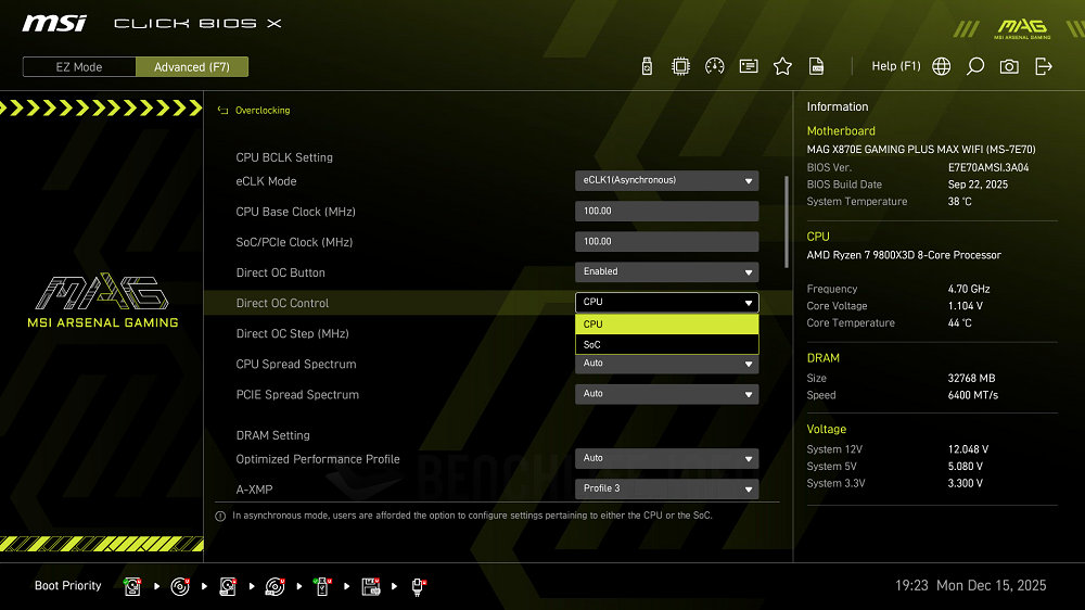 在 UEFI BIOS 有著相對應的性能強化選項,Precision Boost Overdrive 得以自選強化效能、以溫度值作為標的,而使用 X3D 處理器可開啟 X3D Gaming Mode 選項。至於 Direct OC,能夠選擇 eCLK 同步或非同步模式、控制處理器或 SoC 等項目,然後在系統內即時點觸跳線器把玩。