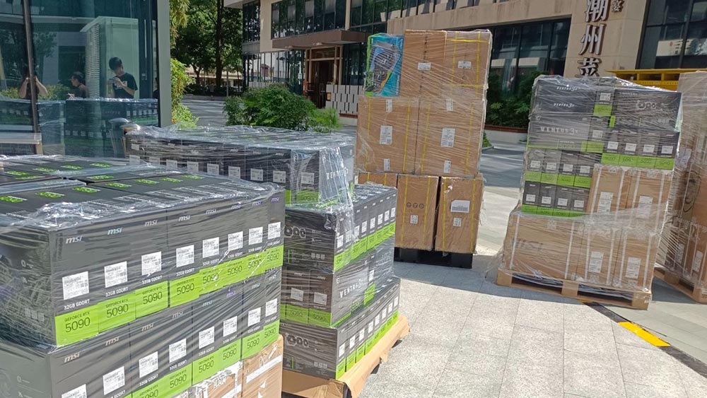 照片中除了 MSI GeForce RTX 5090 顯示卡外,似乎也可以見到 Palit GeForce RTX 5090 GameRock 顯示卡;從照片中的背景來推測,這批 GeForce RTX 5090 顯示卡應該是在中國深圳某地,至於確切的地點就無法知曉。