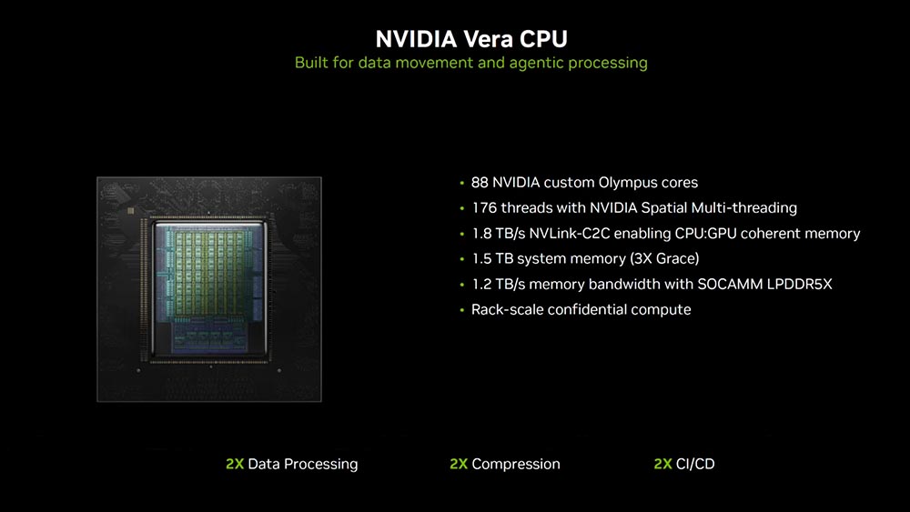 規格可以見到 Vera CPU 最大支援 1.5TB SOCAMM LPDDR5x 記憶體,提供 1.2TB/s 的記憶體頻寬;如果單就記憶體容量,Vera CPU 支援度是 Grace CPU 的 3 倍,此外在 Data Processing、Compression 與 CI / CD 表現都是 Grace 的 2 倍。另一方面,我們也可以見到 Vera CPU 可以提供 1.8TB/s 的 NVLink-C2C 頻寬。