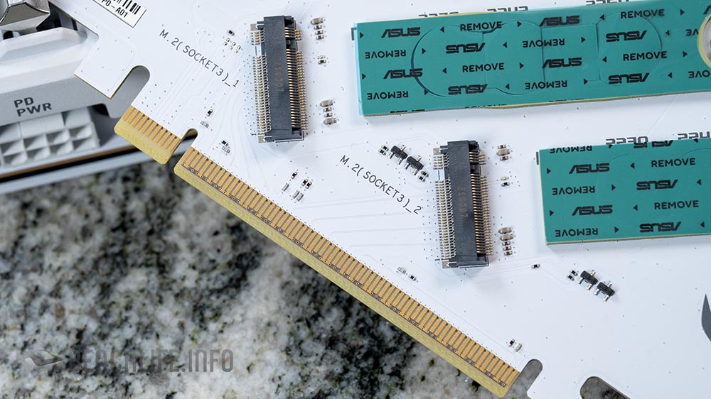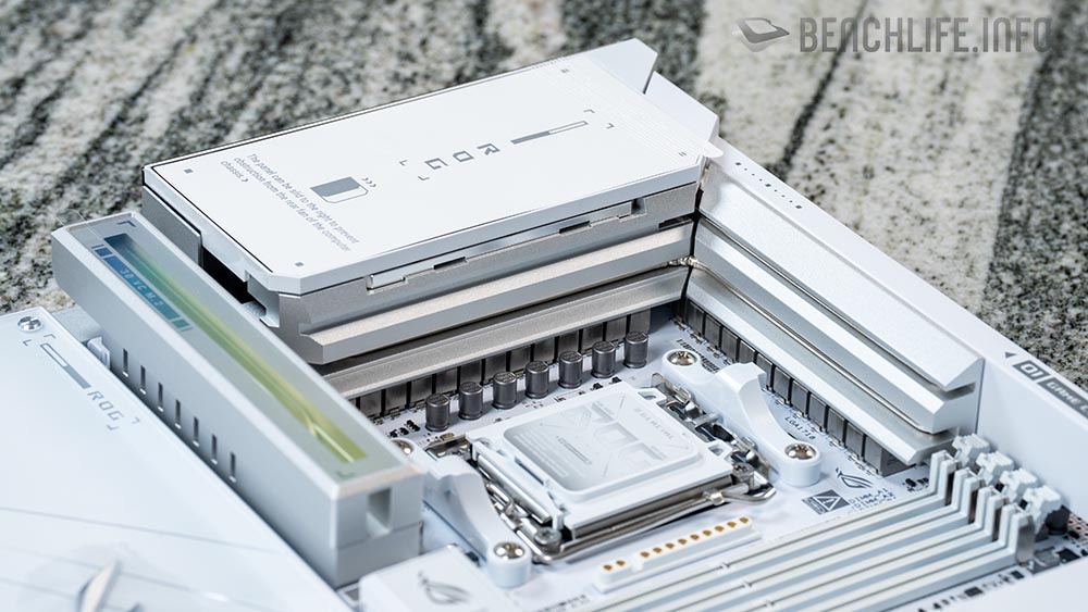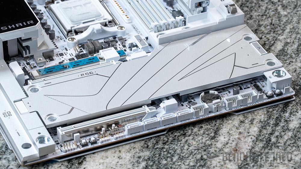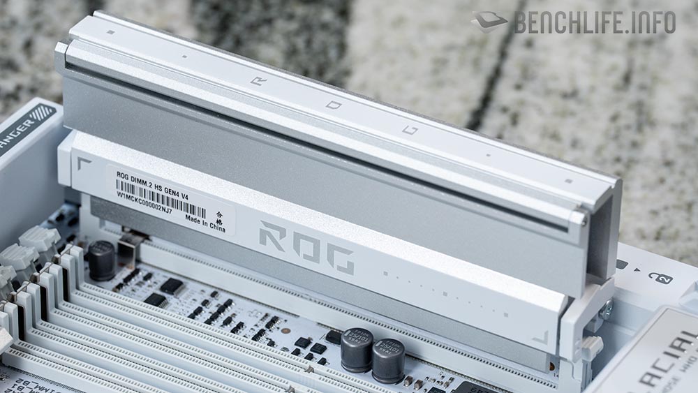 4 根 DDR5 記憶體插槽,但現階段想要將它們插滿就的付出更多的「小朋友」… 我們也可以見到 Q-DIMM.2 插槽,而這次 ASUS 也為這張主機板的 Q-DIMM.2 有了新散熱片設計;Q-DIMM.2 依舊維持在 PCIe 4.0 規格。