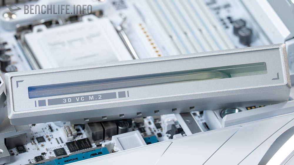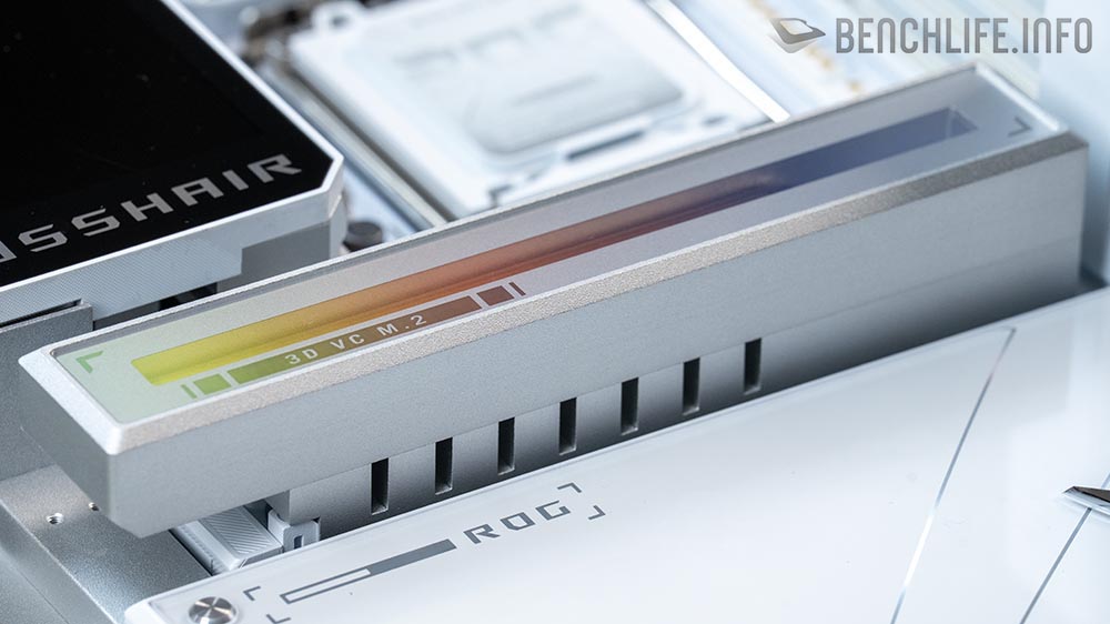 主機板上可以見到 3 組 M.2 插槽,使用 3D VC M.2 散熱器的為 PCIe 5.0 x5 22110 M.2 插槽,另外 2 組分別是 PCIe 5.0 x5 2280 M.2 插槽以及 PCIe 4.0 x5 2280 M.2 插槽(M.2_3);如果加入 Q-DIMM.2 以及主機板附的 ROG Hyper M.2 Card 的話,整張 ROG Crosshair X870E Glacial 可以安裝 7 張 M.2 SSD(4x PCIe 5.0 + 3x PCIe 4.0)。