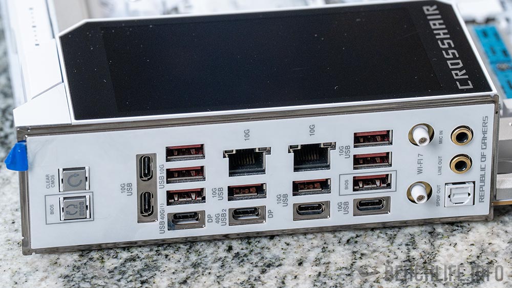 I/O 上可以見到 5 吋 LCD 面板,這部分與 ROG Crosshair X870E Extreme 相同,至於 I/O 配置部分:
