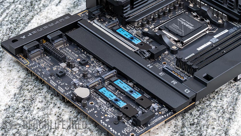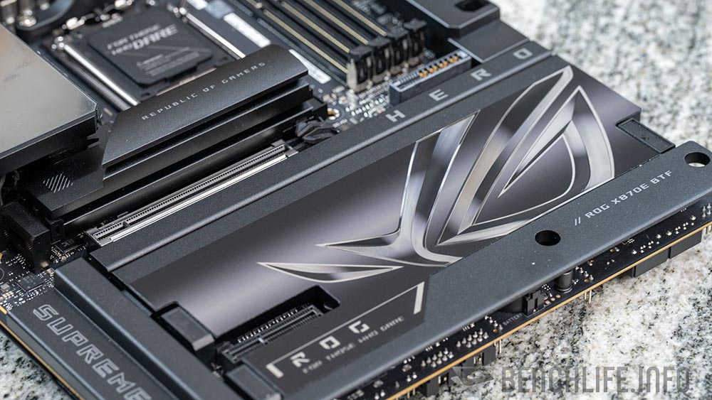 ROG Crosshair X870E Hero BTF 主機板支援 3x PCIe 5.0 x4 頻寬的 M.2 2280 SSD(第一組提供專屬的 M.2 散熱器)與 2x PCIe 4.0 x4 頻寬的 M.2 2280 SSD;另外,主機板上可以見到 1x PCIe 5.0 x16 插槽(PCIe 5.0 x16 頻寬)與 1x PCIe 4.0 x4 插槽(PCIe 4.0 x4 頻寬),前者是 CPU 提供,而後者則來自晶片組。