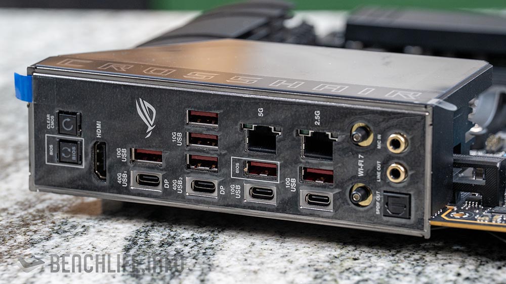 I/O 部分與 ROG Crosshair X870E Hero 相同,可以見到 4x USB-C 連接埠,包含 2x 40Gbps(帶有 DisplayPort 功能)與 2x 10Gbps;另外還有 6x USB-A、HDMI、5G 和 2.5G(Intel I226-V)Ethernet,與採用 Q-Antenna 接頭的 Wi-Fi 7 無線網路,和 ALC4082 Audio Codec 與 ESS ES9219 Quad Dac 的 ROG SupremeFX 7.1 聲道音效。