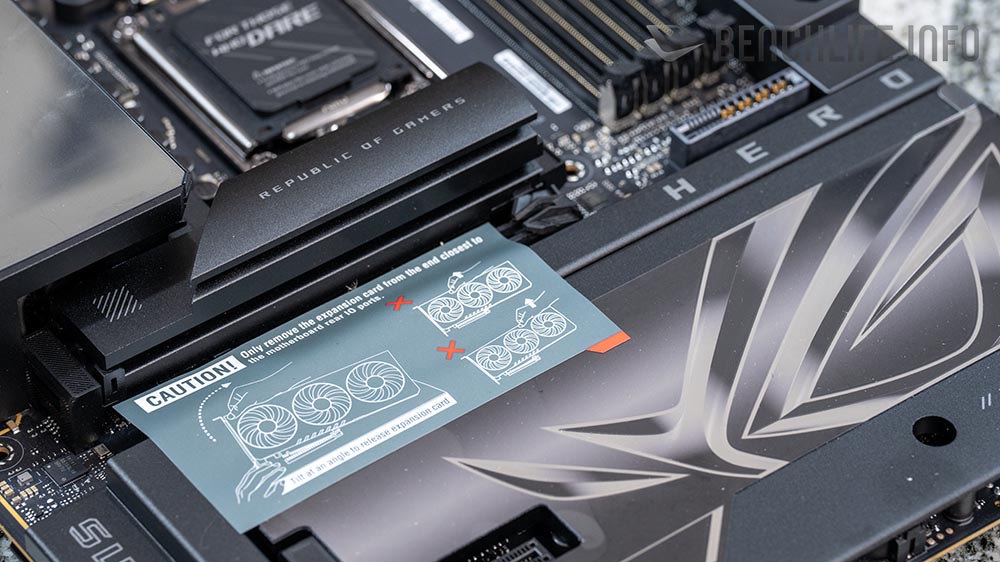一見到主機板本體,可以見到一張貼紙提醒使用者如何將顯示卡從 PCIe Q-Release Slim 卸下,畢竟…