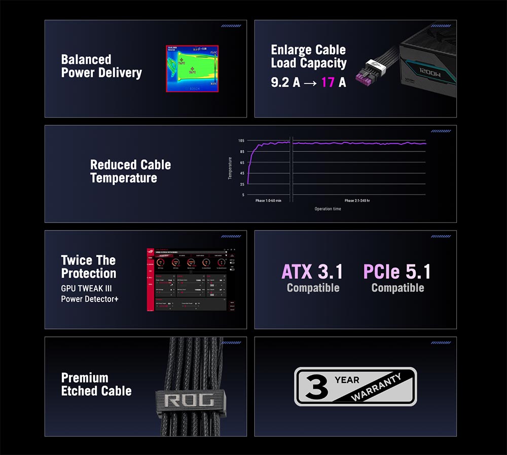 ROG Equalizer 12V-2×6 線材可以做到平衡電流傳輸,同步也提升線材的能耐,從原本的 9.2A 升級至 17A。