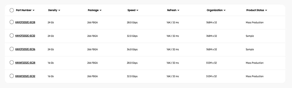 就 WCCFTECH 報導提到,Samsung 目前在 GDDR7 記憶體部分已經提供 5 種選項,其中包含 28Gbps 與 32Gbps 的 16Gb(單顆 2GB)和 28Gbps、32Gbps 與 36Gbps 的 24Gb(單顆 3GB)版本。系列 GDDR7 產品中,28Gbps 的 24Gb 顆粒我們已經在 Blackwell GPU 架構的 RTX Pro 系列專業繪圖卡上見到,而這 28Gbps 的 24Gb 顆粒已經轉量產。
