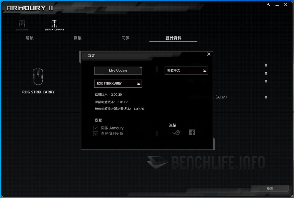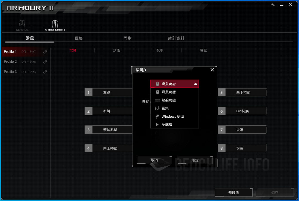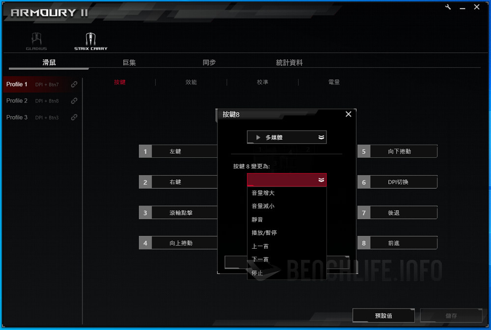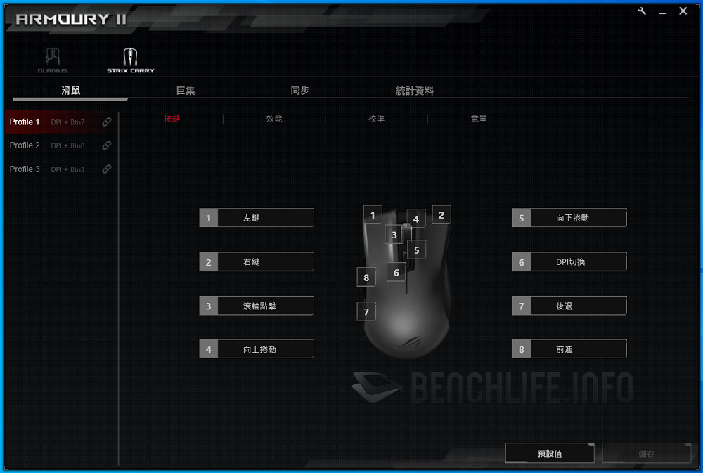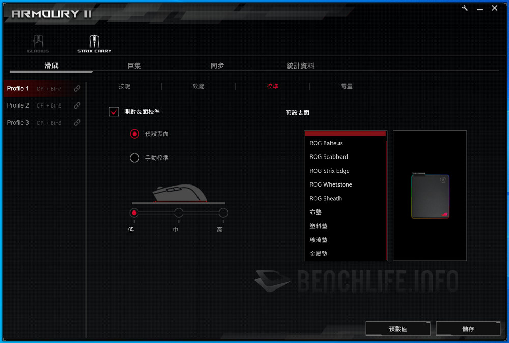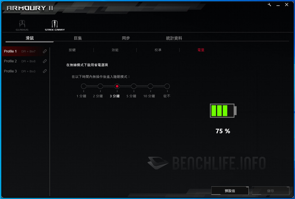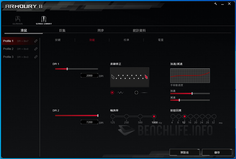 附加軟體為多個兄弟產品通用的 ROG Armoury II,除了左鍵都可以自訂其他用途,如鍵盤功能、巨集、Windows 捷徑、多媒體。而效能設定不外乎是 DPI、輪詢率、加減速等,其中直線修正不同於一併連接著的 ROG Gladius,它只有 2 個選擇而非多階段可自定。至於特有項目是電量,當所使用電池的蓄電量少於 25% 時,DPI 切換鍵那 LED 會閃爍紅燈提示之。而這些個人喜好設定,可以儲存成 3 個設定檔,並藉由 DPI 搭配 7、8、3 鍵組合快速切換。其餘項目多是 ROG Armoury II 既有共通的部分,這邊就不再贅述了。