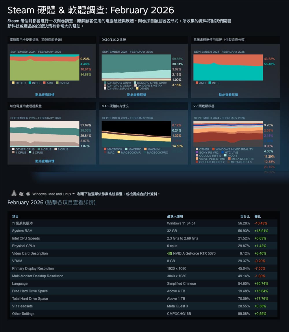 進入到 3 月份,一樣要回顧一下 Steam 遊戲平台 2 月份的硬體 & 軟體調查數據。就如一開始所述,2 月份的顯示卡數據有點出入,因為就前 10 大排名的第一位來看,NVIDIA GeForce RTX 5070 這個型號在 2 月份的使用率就增加了 6.55%… 此外,GeForce RTX 5060 與 GeForce RTX 5060 Ti 分別有著 4.22% 與 2.71% 的增幅,過去,我們鮮少見到如此的狀況。