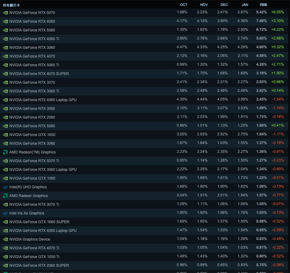Blackwell GPU 架構的 GeForce RTX 50 系列已經是市場主流產品,2 月份除了 GeForce RTX 5070 Ti 被 GeForce RTX 5080 超越外,其並沒有什麼太大變化。NVIDIA GeForce RTX 5050 依然沒有在顯示卡使用名單中現身。