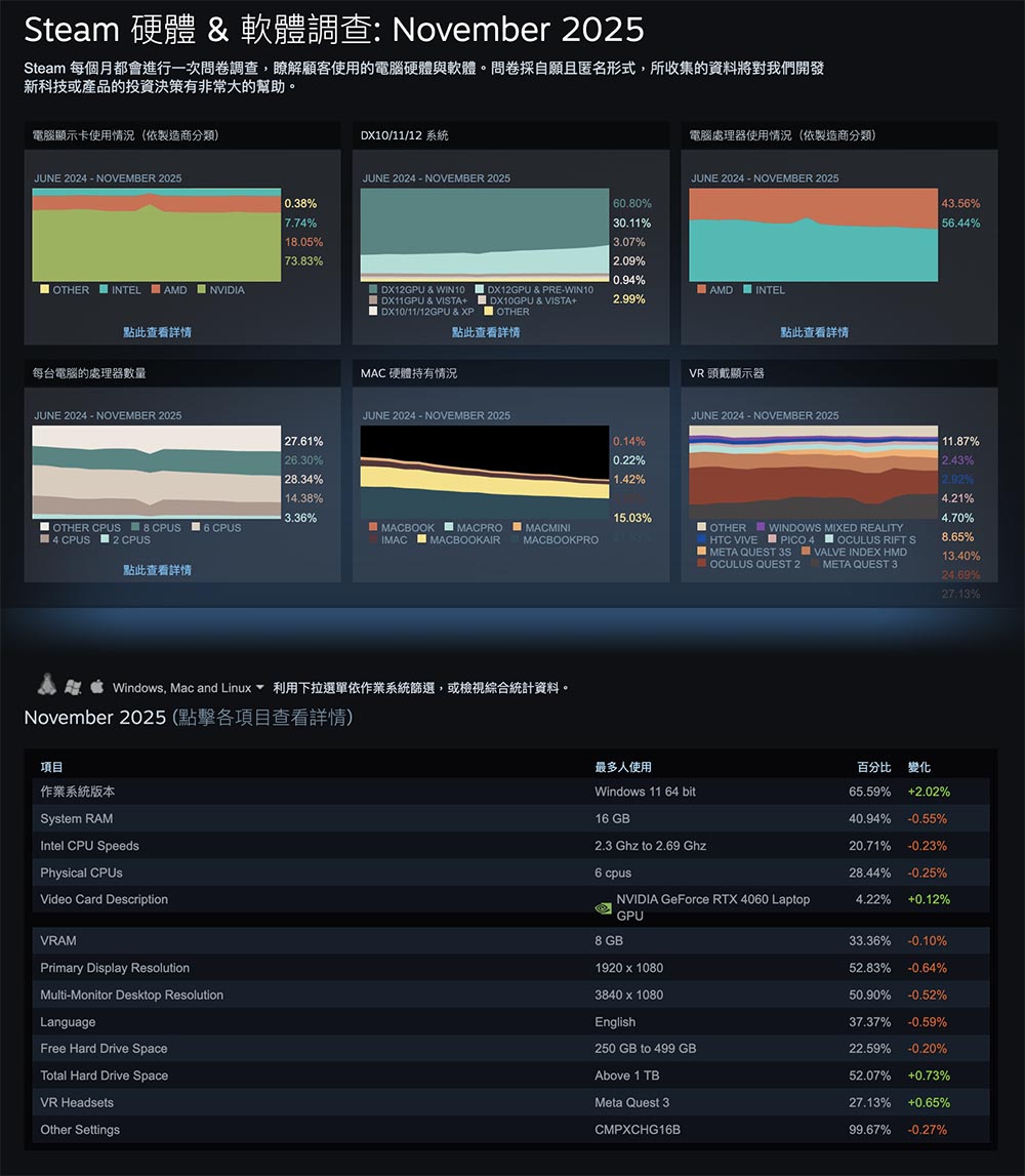 步入 12 月份,2025 年也要走到尾聲,但我們先看看 11 月份的 Steam 遊戲平台統計數據。