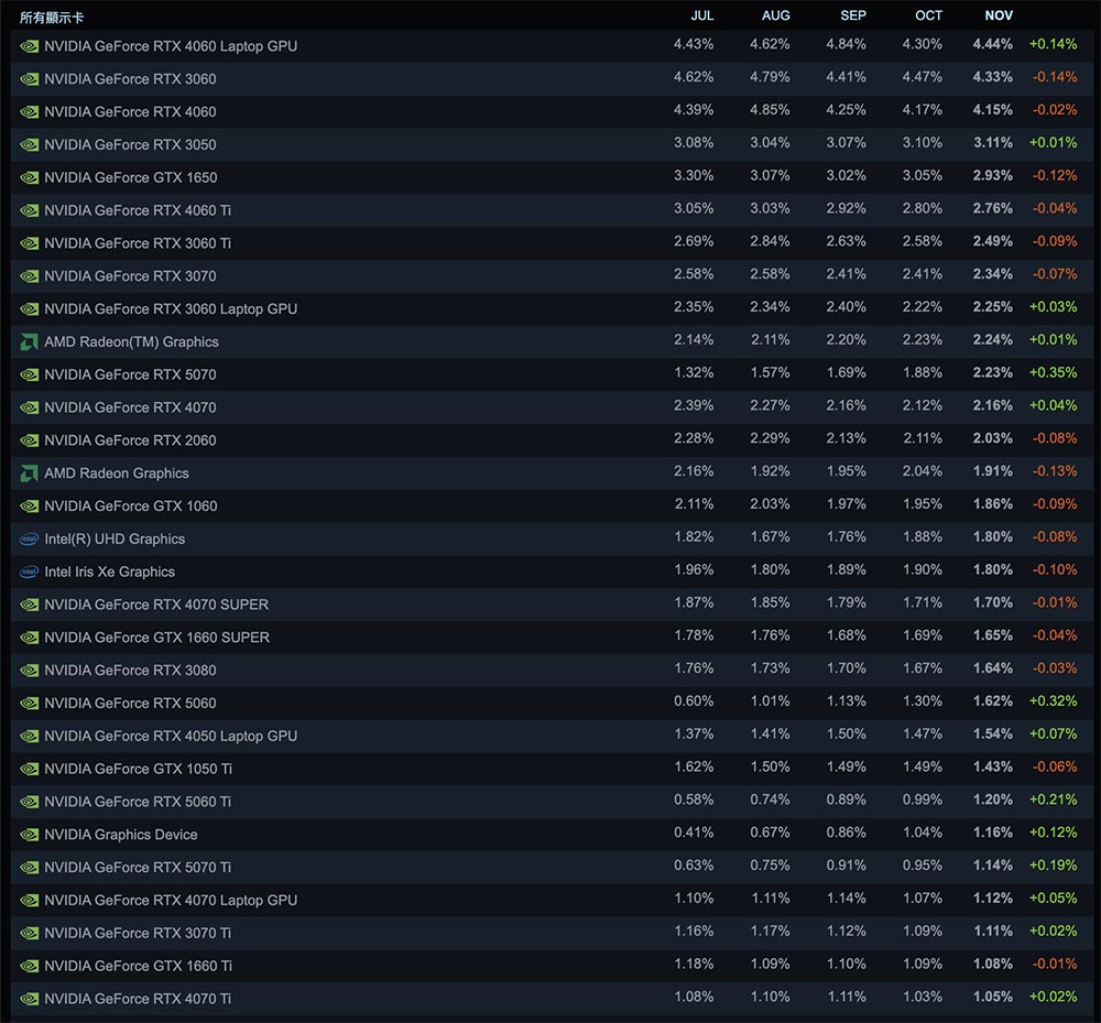 在 10 月份的數據,顯示卡第 10 位是 GeForce RTX 4070,進入到 11 月份,它則是被 AMD Radeon Graphics 以及 GeForce RTX 5070 擠到第 12 位,GeForce RTX 5070 則是整個 Blackwell GPU 架構產品中,唯一一款最接近 10 大的顯示,其使用率為 2.23%,與 AMD Radeon Graphics 僅差 0.01%。