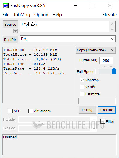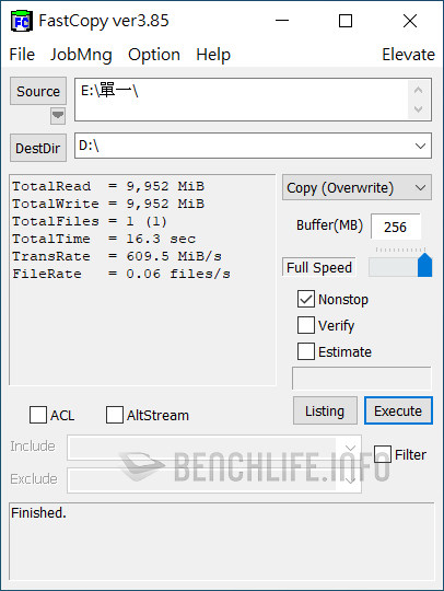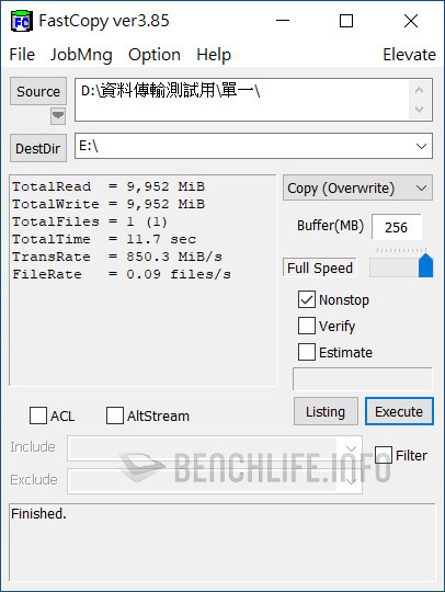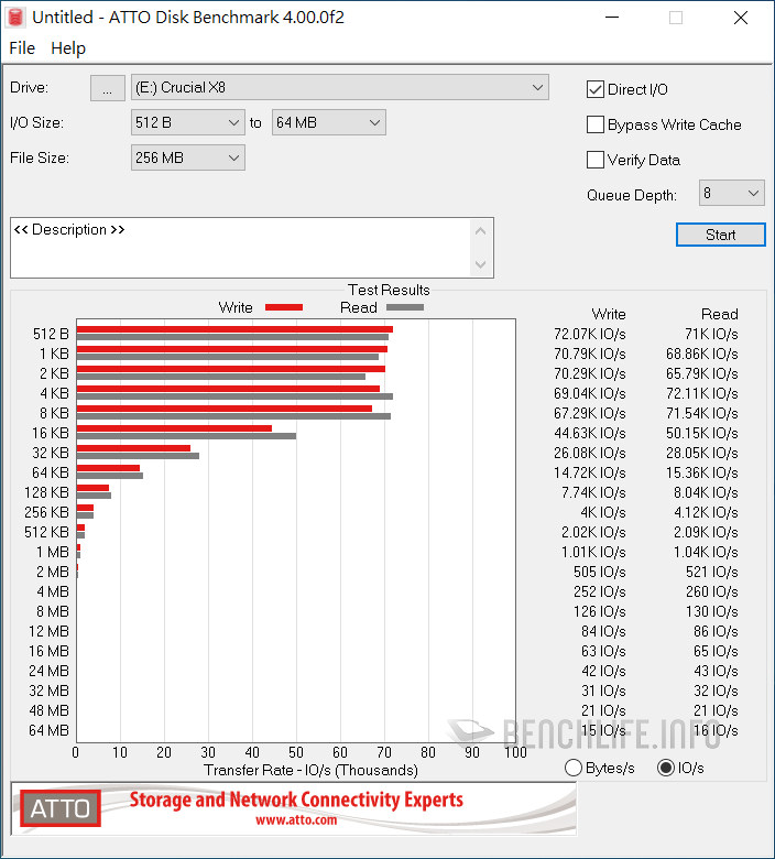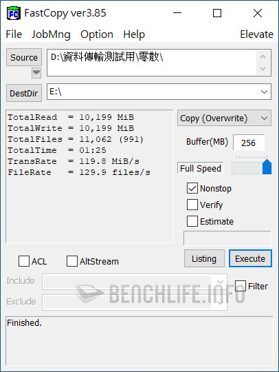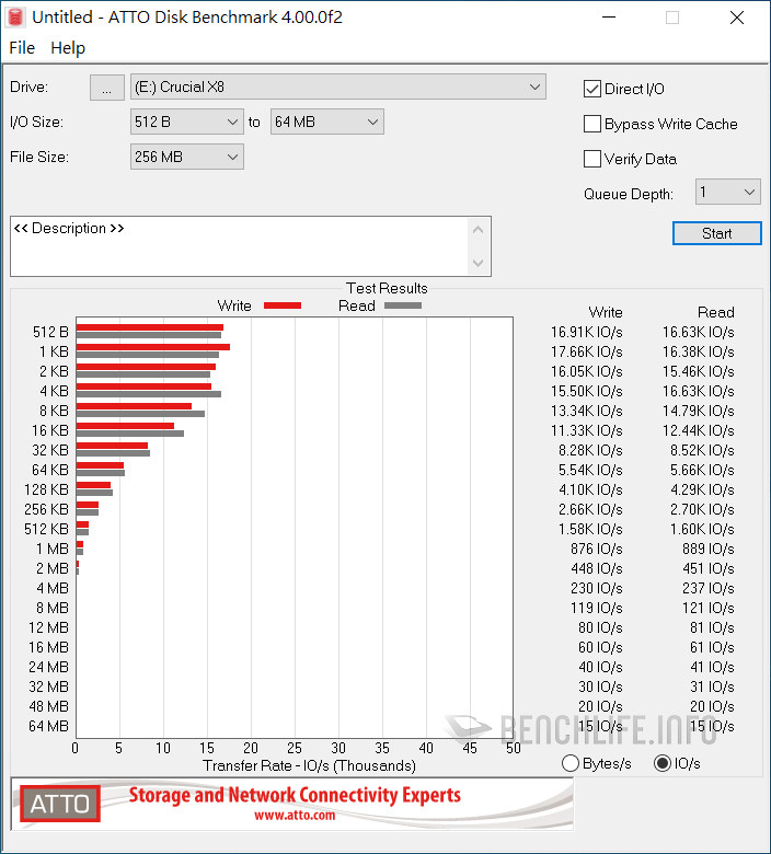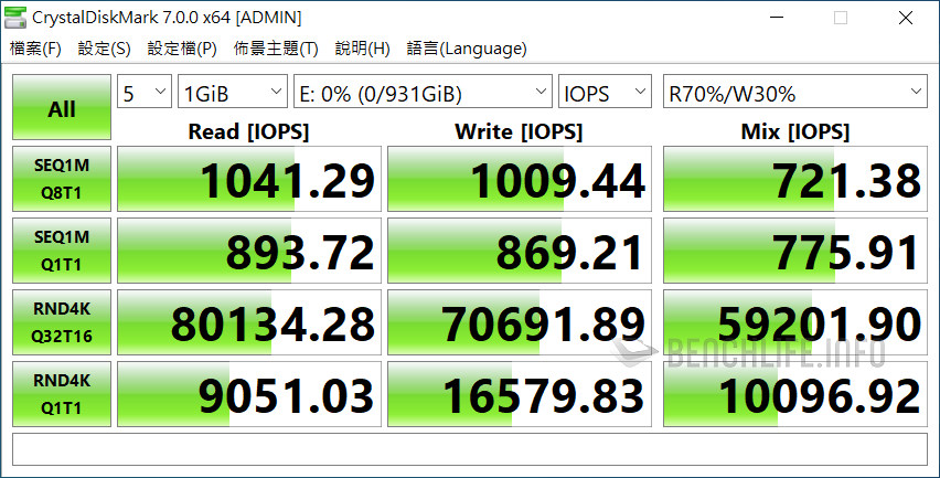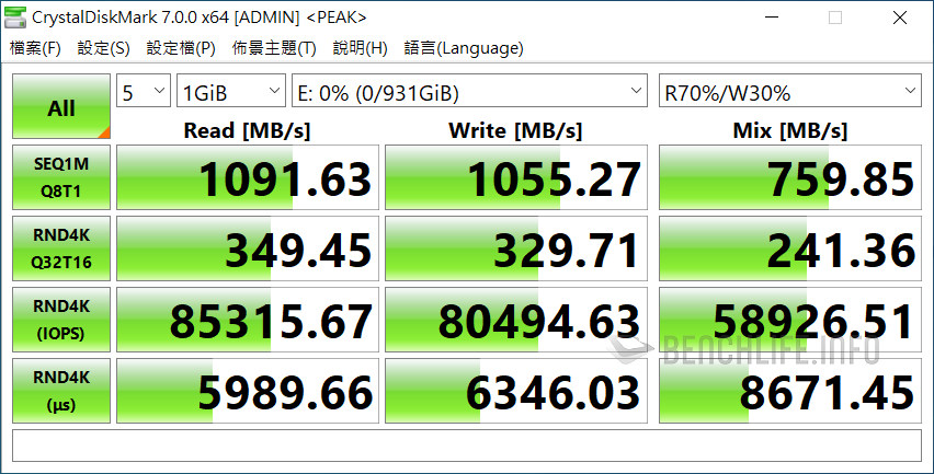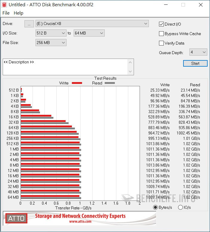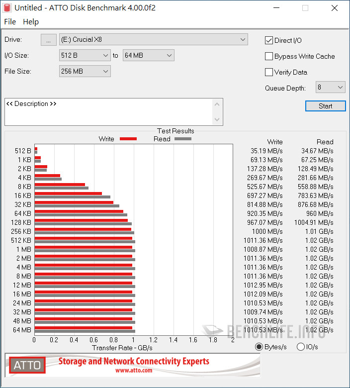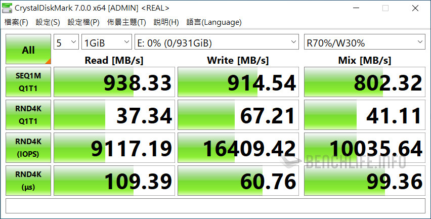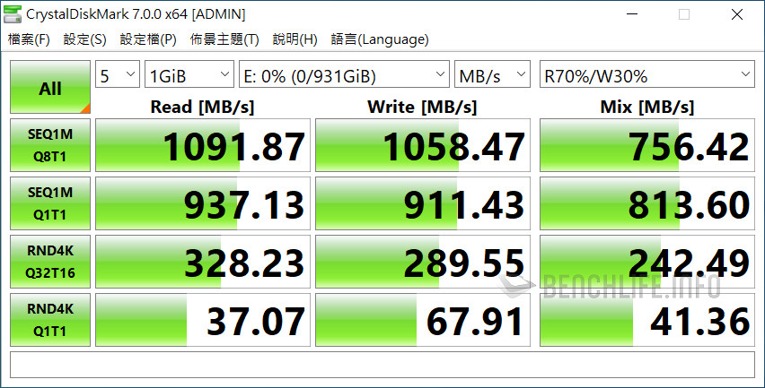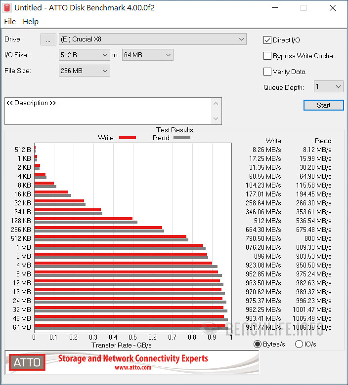 實測於單一執行緒、線程條件下,ATTO Disk Benchmark 表現為讀取 1006.39MB/s、寫入 991.77MB/s,CrystalDiskMark 是以 Real 模式讀取 938.33MB/s、寫入 914.54MB/s 為佳。當 ATTO Disk Benchmark 設定佇列深度 8 時,其表現來到讀取 1.02GB/s、寫入 1010.53MB/s,CrystalDiskMark 預設 SEQ1M Q8T1 條件下,更是達到讀取 1091.63MB/s、寫入 1055.27MB/s。